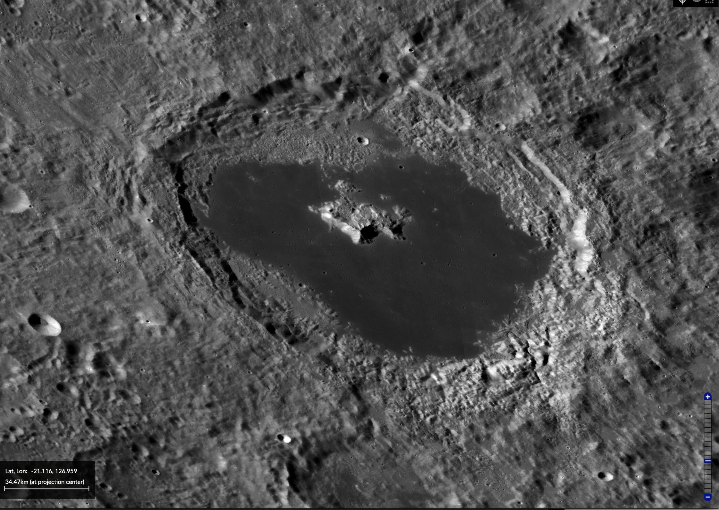 One of the most visible features on the back side of the moon is the massive Tsiolkovsky crater. With a diameter of 115 miles, and a central peak rising over 1.8 miles tall, it was named after Konstantin Tsiolkovsky (1857 - 1935), the great 19th century Russian scientists who is considered the “Grandfather of Space Travel".” (1)